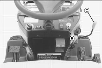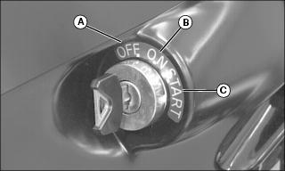 C - START Position - Move key from ON to this position and the starter will engage the engine flywheel to start the engine. Release the key to the ON position.