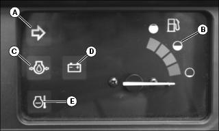 C - Engine Oil Pressure Light - This light will turn on when the ignition key is in the ON position and the engine is not running. If this light turns on while the engine is running, engine oil pressure is too low. Stop engine.