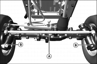 5. Position drain pan under axle drain plug (B) on both sides of front axle.