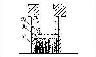 3. Check electrolyte level. Electrolyte (B) should be approximately halfway between bottom of filler neck (A) and top of plates (C).