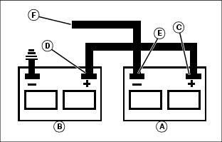 4. Connect the other end (F) of negative (–) booster cable to a metal part of the disabled machine engine block away from battery.