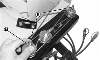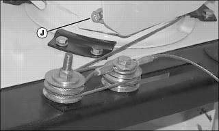 8. Remove cable ends (F) and (G) from pulleys. Remove cable assembly.