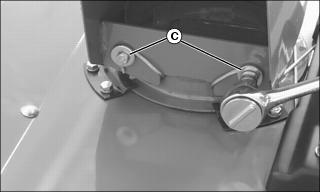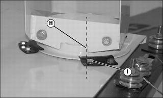 11. Move chute so tab (H) on chute is in line with edge of capscrew (I). Chute opening will be on the left.