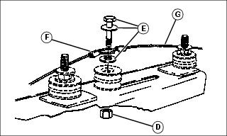 10. Install bolt and washers (E) in cable assembly eyelet. Install nut (D).