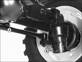 5. Position drain pan under axle drain plug (B) on both sides of front axle.