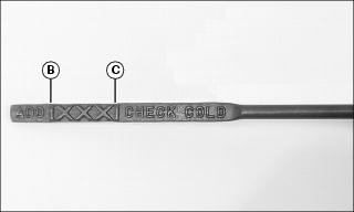 4. Remove dipstick and check oil level. Oil level should be between the minimum (B) and maximum (C) lines.