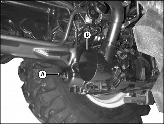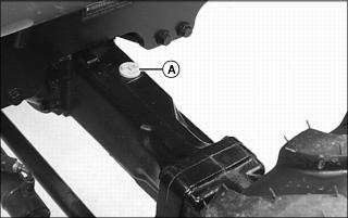 3. Position drain pan under transmission drain plug (A) and suction filter assembly on left side of transmission. Remove plug and allow oil to drain.