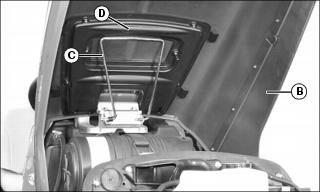 3. Raise hood (B) until spring loaded support rod (C) is behind stop (D), then lower hood against stop.