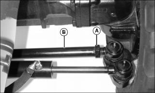 2. Rotate tie rods (B) clockwise or counterclockwise to adjust the amount of toe-in. Adjust tie rods until toe-in measurement is within correct specification.