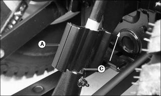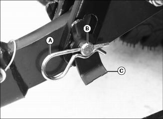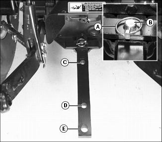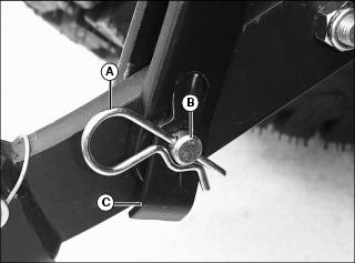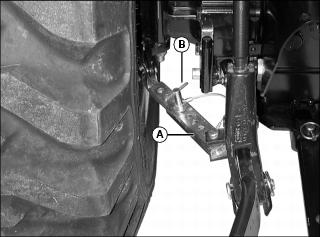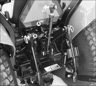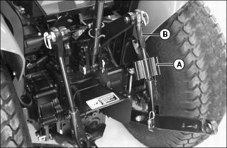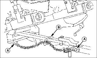 2. Install additional attaching points (B) for the chain on drawbar to reduce slack in chain when necessary.