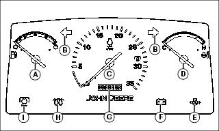 F-Alternator/Battery Discharging Light: This light should illuminate when the ignition key switch is in the run position and the engine is not running. If this light does illuminate with the engine running, see your John Deere dealer.