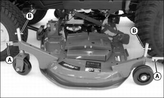 Picture Note: Four spring locking pins (B) are shown. Store other spring locking pins in lift pin holes or off mower.