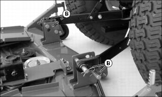10. Install pins (B) in lowest shaft hole above wheel bracket to keep same height setting for later mower installations.