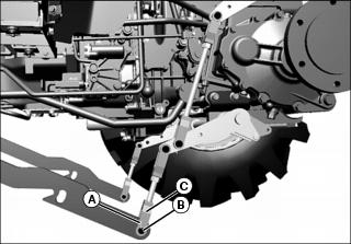 3. Turn each yoke (C) clockwise to raise the lift arm or counterclockwise to lower the lift arm.