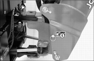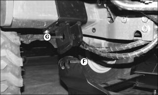 9. Use boom and stabilizer control levers to alternately raise the boom and stabilizers, pivoting the subframe on the draft link pins until the holes in the subframe front end (F) align with holes in front hanger (G).