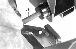 13. Drive tractor ahead slowly until both subframe hooks (E) clear mounting support draft link pins (F).
