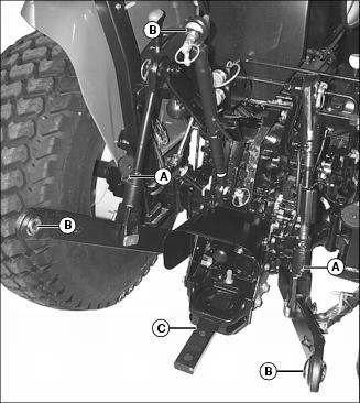 B - Left Steering Cylinder Ball Joint D - Right Steering Cylinder Ball Joint Lubricating 3 Point Hitch• Lubricate lift link grease fittings (A) with recommended grease or an equivalent. • Lubricate ball joints (B) and draw bar (C) with SUPER LUBE lubricant. |