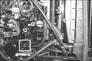 5. Remove all dirt and debris from radiator fins (C), and fan shroud (D) using compressed air or water.