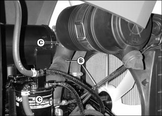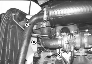 3. Locate lower air intake hose (B) below muffler, and tighten hose clamps (C).