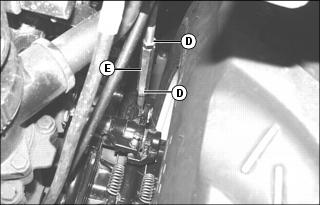 • To adjust lift pedal linkage, loosen both jam nuts (D) away from the turnbuckle (E). Turn turnbuckle clockwise to increase pedal travel distance, and counterclockwise to decrease pedal travel distance.