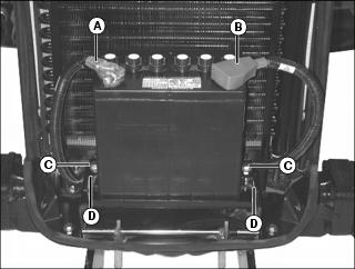 5. Loosen bolts (C) and remove battery compartment hold- down brackets (D).