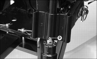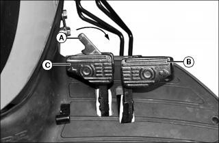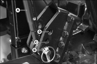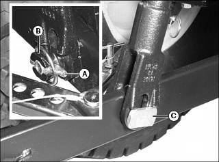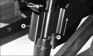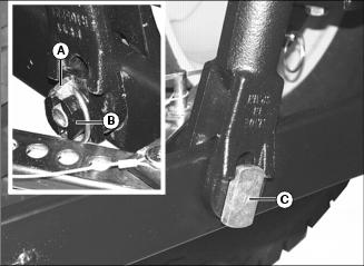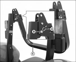 4. Install drilled pins (B) and spring locking pins (A) to lock crossbar (C) in the lowered position.