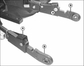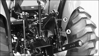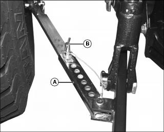 2. Install additional attaching points (B) for the chain on drawbar to reduce slack in chain when necessary.