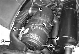 6. Release latches (C) and remove air cleaner canister cover (D).