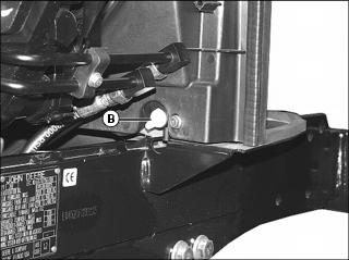 5. Remove front of air intake hose (A) from radiator shroud adapter, and remove strap (B) holding air cleaner base in place.