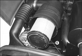 7. Raise air cleaner base slightly, and remove and discard primary element (E). Clean out any dirt in canister, taking care not to damage the secondary filter element. Replace with a new primary filter element.