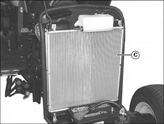 5. Remove all dirt and debris from radiator fins (C), and fan shroud (D) using compressed air or water.