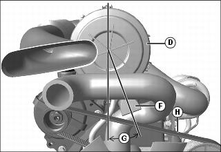 8. Install air cleaner canister cover (D) with rubber dust unloading valve (F) pointing 30? (G) from vertical to clear belt (H).