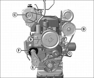 a. Back-wrap belt around the fan pulley (B), route it over the alternator (C), over top of the idler pulley (or compressor sheave on cab tractors) (D), then down and around the crankshaft pulley (E).