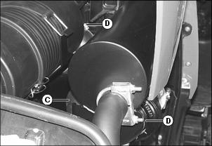 4. Locate lower air intake hose (C) below muffler, and tighten hose clamps (D).
