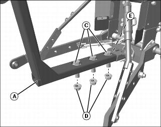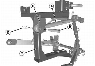 1. Remove pin and locking clip from front of center link (A), and install rear end onto bracket (B) on lower mounting frame (C). Secure with pin (D) and spring locking pin (E).