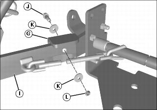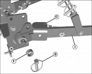 4. Install bellcrank (G) onto pivot shaft (H), aligning hole in bellcrank with hole in left lift arm (I). Install quick-locking pin (D) onto pivot shaft (H).
