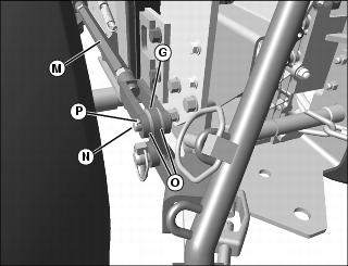 6. Connect lift rod assembly (M) to top hole in bellcrank (G) with one 5/8x1-39/64 in. drilled pin (N), two 11/16 in. washers (O) inside of yoke, and one 3.2x25 mm cotter pin (P).