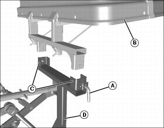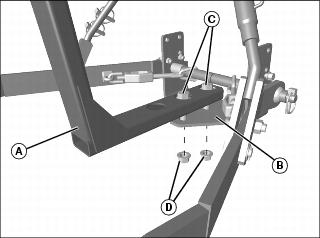 • For 2305 and 2210 tractors, install lower mounting frame (A) onto rear hitch (B) with two M20x60 bolts (C), and M20 flange nuts (D). Tighten hardware to 620 Nm (457 lb-ft).