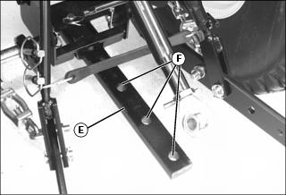 • For 2320 and 2520 tractors, install rear hitch bar (E) onto rear hitch plate, so three holes (F) on bar are exposed.