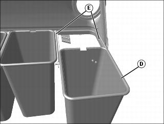 6. Slide bags (D) into position on support frame (E) so the safety decals are visible at rear of machine.