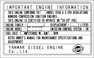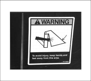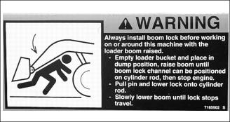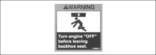 Safety LabelsUnderstanding The Machine Safety LabelsThe machine safety labels shown in this section are placed in important areas on your machine to draw attention to potential safety hazards. On your machine safety labels, the words DANGER, WARNING, and CAUTION are used with this safety-alert symbol. DANGER identifies the most serious hazards. The operator's manual also explains any potential safety hazards whenever necessary in special safety messages that are identified with the word, CAUTION, and the safety-alert symbol. WARNINGPicture Note: Located on left loader boom cylinder. Always install boom lock before working on or around this machine with the loader boom raised.· Empty loader bucket and place in dump position, raise boom until boom lock channel can be positioned on cylinder rod, then stop engine. · Pull pin and lower lock onto cylinder rod. · Slowly lower boom until lock stops travel. WARNINGPicture Note: Located on inner right post of ROPS. AVOID CRUSHING. Do not jump if machine tips.CAUTIONPicture Note: Located on inner left post of ROPS. AVOID DEATH OR SERIOUS INJURY - Read and understand Operator's Manual before operating this machine.· Before leaving seat: Lower working tools to ground, place in neutral and engage parking brake. · Engage backhoe boom and swing locks before transporting. · Avoid contact with overhead obstacles when operating or hauling machine. WARNINGPicture Note: Located on upper PTO shaft shield. AVOID INJURY FROM PTO .· Keep hands, feet and clothing away. DANGER/POISENPicture Note: Located on top of battery. KEEP OUT OF REACH OF CHILDREN. DO NOT TIP. KEEP VENT CAPS TIGHT AND LEVEL.· SHIELD EYES. EXPLOSIVE GASES CAN CAUSE BLINDNESS OR INJURY. · SULFURIC ACID CAN CAUSE BLINDNESS OR SEVERE BURNS. · FLUSH EYES IMMEDIATELY WITH WATER. GET MEDICAL HELP FAST. DANGERPicture Note: Located on top of starter. Start only from seat in park or neutral.CAUTIONPicture Note: Molded onto muffler. No-text warning: Hot Surface.· Do not touch engine muffler, it may be hot. WARNINGPicture Note: Located on top of coolant fan shroud. · DO NOT OPEN PURGE VALVE WHILE ENGINE IS WARM AND WITHOUT FIRST READING OPERATOR'S MANUAL. · VALVE WILL RELEASE HOT PRESSURIZED COOLANT AND SERIOUS INJURY MAY RESULT. WARNINGPicture Note: Located on top of backhoe crowd cylinder. Turn engine "OFF" before leaving backhoe seat. WARNINGPicture Note: Located on wedge bar at backhoe bucket attach point. DO NOT OPERATE ATTACHMENT WITHOUT WEDGE BAR BOLT TIGHTENED TO (100 FT LBS) AND LYNCH PINS INSERTED INTO WEDGE BAR PINS. FAILURE TO FOLLOW THESE INSTRUCTIONS MAY CAUSE INJURY IF ATTACHMENT COMES OFF. WARNINGPicture Note: Located on backhoe on front of right-side foot guard. · Keep both feet on platform and away from stabilizers when operating. WARNINGPicture Note: Located on backhoe on back of right-side foot guard. · Enter and exit only from this side. · Avoid contact with controls when entering and exiting. · DO NOT operate controls from the ground. WARNINGPicture Note: Located on backhoe on back of left-side foot guard. · Operate controls only from seat. · DO NOT enter or exit from this side. WARNINGPicture Note: On each side of multi-purpose loader bucket only. To avoud injury, keep hands and feet away from this area. Emission Control System Certification LabelThe emissions warranty described in the warranty section applies only to those engines marketed by John Deere that have been certified by the United States Environmental Protection Agency (EPA) and/or California Air Resources Board (CARB); and used in the United States in non-road mobile (self-propelled or portable/transportable1) equipment. The presence of an emissions label like the one shown signifies that the engine has been certified with the EPA and/or CARB. The EPA and CARB warranties only apply to new engines having the certification label affixed to the engine and sold as stated above in the geographic areas governed by the regulating agencies. NOTE: The hp/kW rating on the engine emissions certification label specifies the gross engine hp/kW, which is flywheel power without fan. In most applications this will not be the same rating as the advertised vehicle hp/kW rating. |