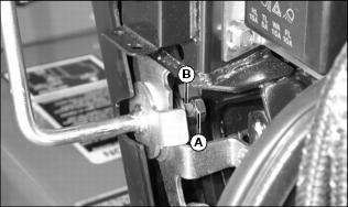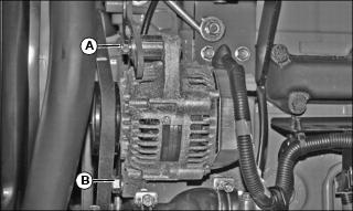 1. Loosen adjusting bolt (A) on alternator on left side of machine.
