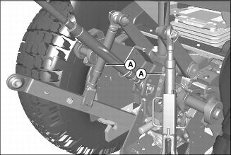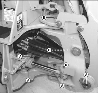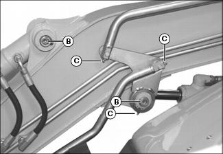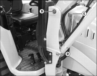Service LubricationGreaseThe following greases are preferred:• John Deere Multi-Purpose SD Polyurea Grease • John Deere Multi-Purpose HD Lithium Complex Grease If not using any of the preferred greases, be sure to use a general all-purpose grease with an NLGI grade No.2 rating. Wet or high speed conditions may require use of a special-use grease. Contact your Servicing dealer for information. The following lubricant is preferred:• SUPER LUBE® lubricant.1 Lubricating Loader and Loader Boom1. Lubricate pivot grease fittings (A) on each side of the boom. 2. Lubricate pivot grease fittings (B) on each side of boom. 3. Lubricate anti-rollback linkage grease fittings (C) on left side of boom. 4. Lubricate pivot grease fittings (D) on each side of loader. 5. Lubricate anti-rollback linkage grease fitting (E). Lubricate Optional Loader Multi-Purpose Bucket Pivots• Lubricate grease fittings (A) on each end of bucket. Lubricating Backhoe Linkage, Pivots, and Cylinder Rod EndsNOTE: Cylinder grease fitting (C) is easier to access if boom is swung fully left or right. 1. Lubricate pivot grease fittings (A) on each side of backhoe. 2. Lubricate pivot grease fittings (B) and (C). 3. Lubricate pivot grease fittings (D) on each side of dipperstick. 4. Lubricate pivot grease fittings (E). 5. Lubricate pivot grease fittings (F). Lubricate Backhoe Stabilizers• Lubricate pivot grease fittings (A) and (B) on each stabilizer. Lubricating 3-Point Hitch |