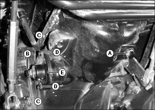 10. Install suction screen cover (E) with O-ring (G) onto transmission housing with hardware (C) and (D).