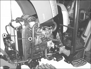 1. Raise hood, remove screen (A), and check air conditioner condenser (B) for dirt and debris. Clean condenser using a brush or compressed air.