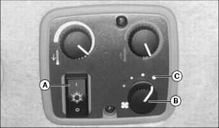 2. Run engine at 2000 rpm. Push top half of A/C and defrost switch (A) and set blower control knob (B) to high position (C). If cooling is intermittent, clean hood grille, radiator and condenser. If problem is not solved, see your John Deere dealer.