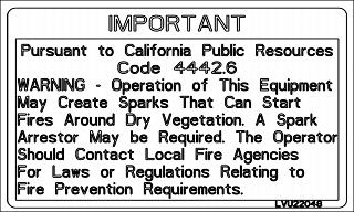 • WARNING - Operation of This Equipment May Create Sparks That Can Start Fires Around Dry Vegetation. A Spark Arrestor May be Required. The Operator Should Contact Local Fire Agencies For Laws or Regulations Relating to Fire Prevention Requirements.