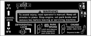 To avoid injury, read operator’s manual. Keep all shields in place. Stop engine, set park brake and remove key before leaving or servicing machine.