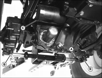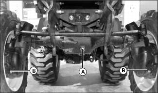 5. Position drain pan under axle drain plug (B) on both sides of front axle.