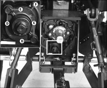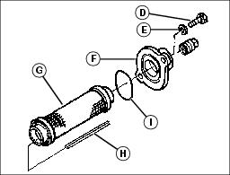 12. Install suction screen cover (F) with O-ring (I) onto transmission housing with hardware (D) and (E).
